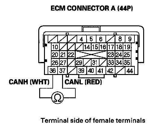 38. Measure resistance between ECM connector terminals A36 and A37.