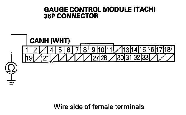 11. Check for continuity between gauge control module (tach) 36P connector terminal No.1 and body ground.