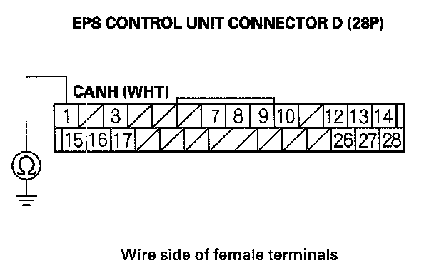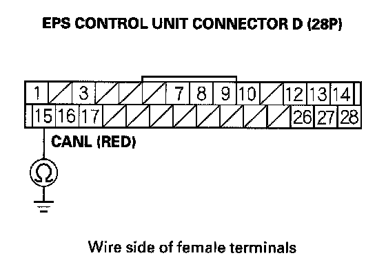 16. Check for continuity between EPS control unit connector D (28P) terminal No.1 and body ground.