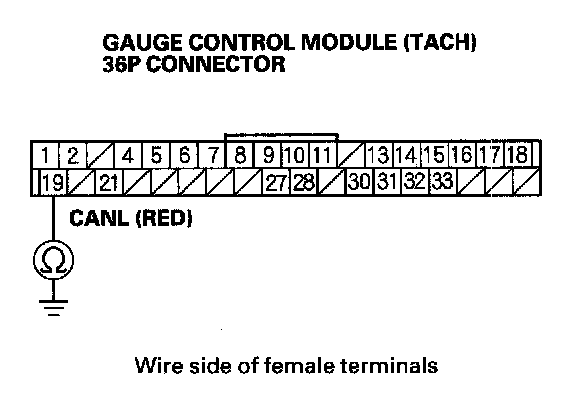 19. Check for continuity between gauge control module (tach) 36P connector terminal No.19 and body ground.