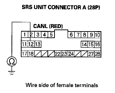 15. Check for continuity between SRS unit connector A (28P) terminal No.11 and body ground.