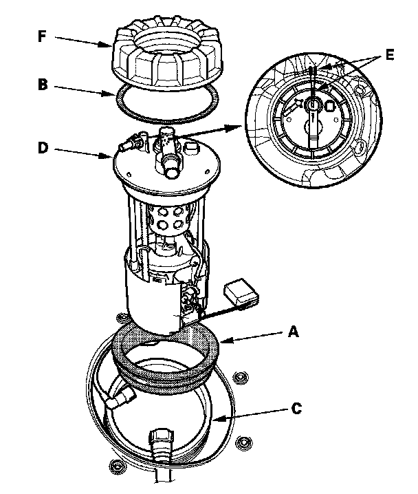 2. Insert the fuel tank unit (D) into the fuel tank. Be careful not to bend the fuel gauge sending unit.
