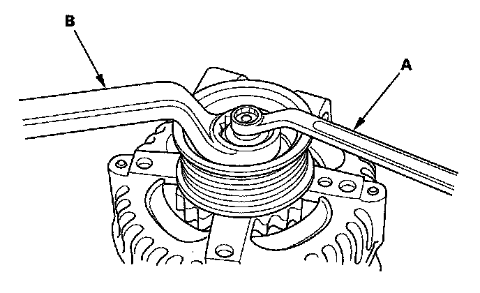 3. If the front bearing needs replacing, remove the pulley lock nut with a 10 mm wrench (A) and a 22 mm wrench (B). If necessary, use an impact wrench.