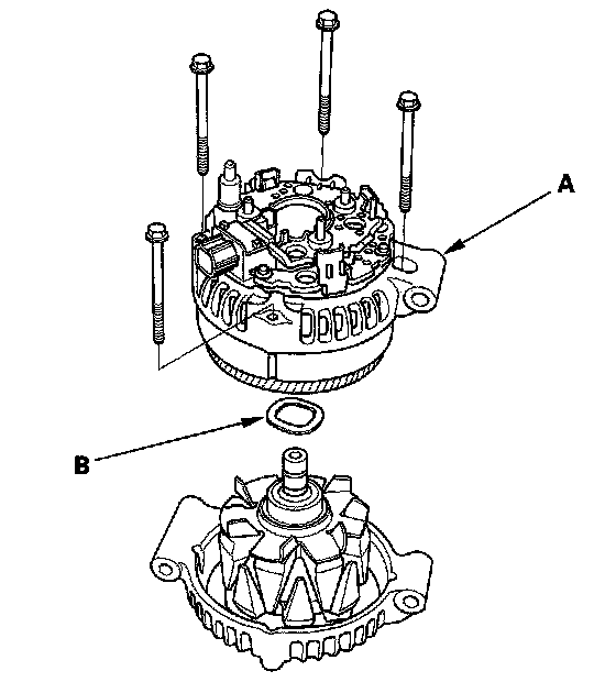 7. Remove the four bolts, then remove the rear housing assembly (A), and washer (B).