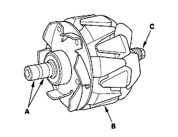 15. Check for continuity between each slip ring and the rotor (B) and the rotor shaft (C).