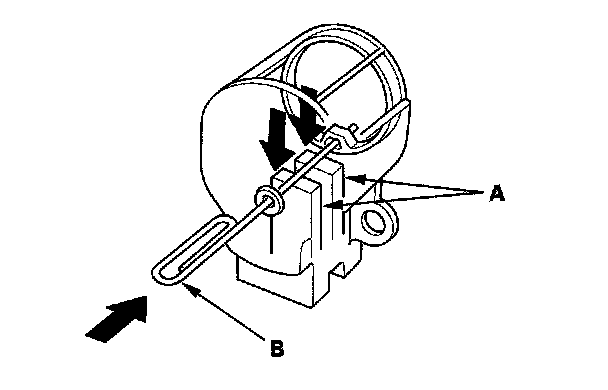 19. Push the brushes (A) in, then insert a pin or drill bit (B) (about 1.6 mm (0.06 in.) diameter) to hold them there.