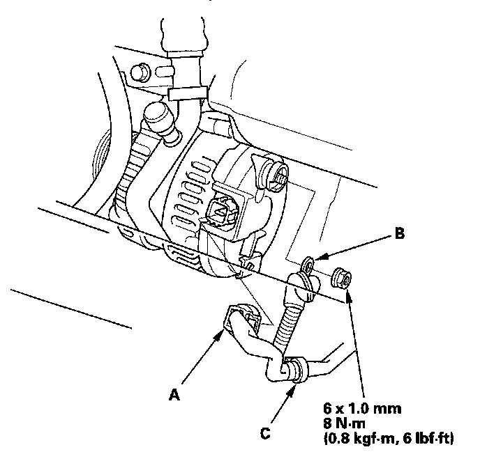 9. Disconnect the alternator connector (A), BLK wire (B) and harness clamp (C) from the alternator, then remove the alternator.