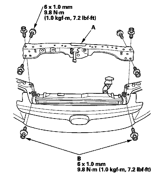 3. Install the bulkhead (A), then install the condenser bracket mounting bolts (B).
