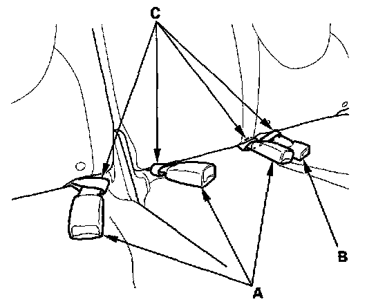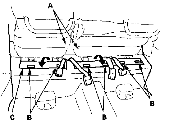 1. Pull the rear seat belt buckles (A) and the center shoulder seat belt detachable anchor (B) out through each elastic band (C) on both seat cushions. Then lift both seat cushions up.