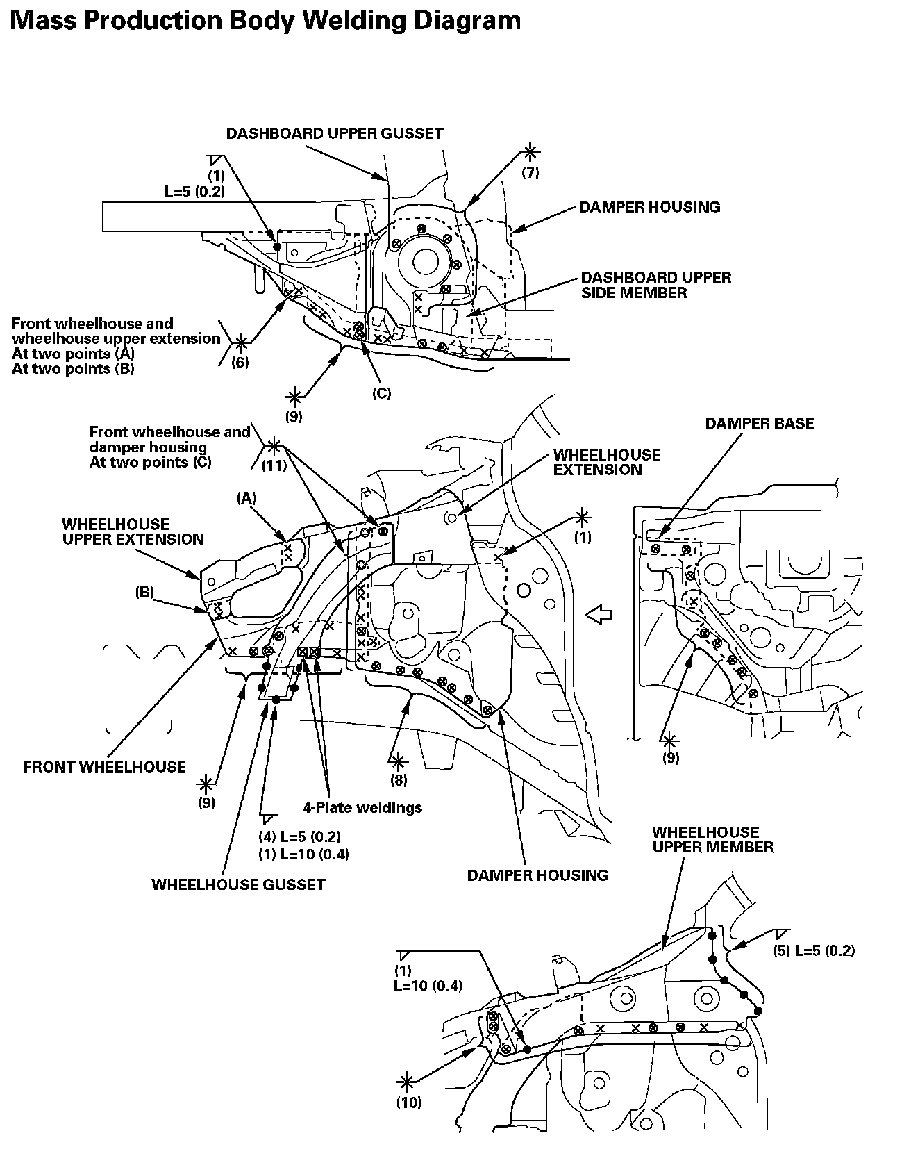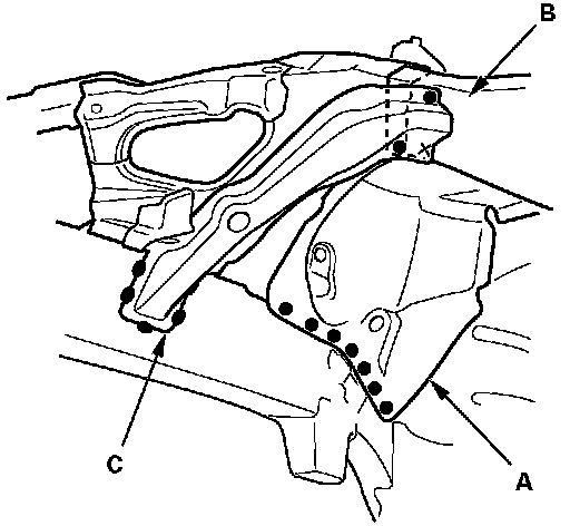 - Weld the damper housing (A), wheelhouse extension (B) and wheelhouse gusset (C).