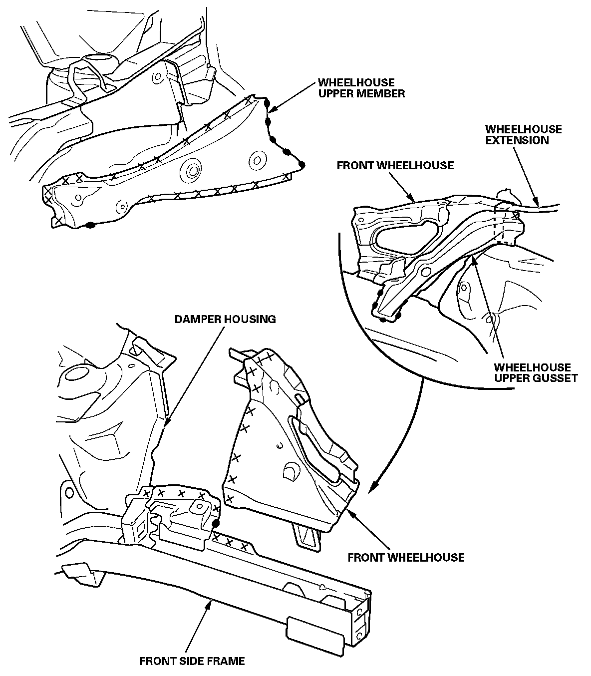 - If necessary, replace the damper housing and wheelhouse extention as an assembly.