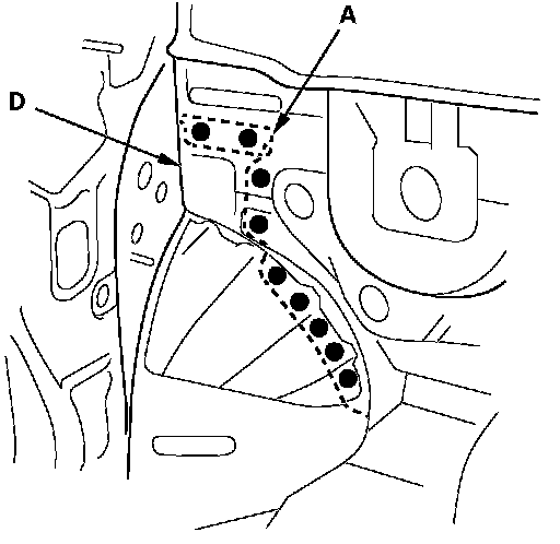 - From the passenger s side, plug weld the holes in the dashboard lower (D) and damper housing.