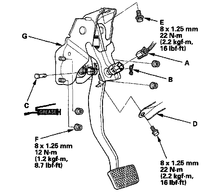 5. Remove the brake pedal bracket mounting bolt (E) and nuts (F).
