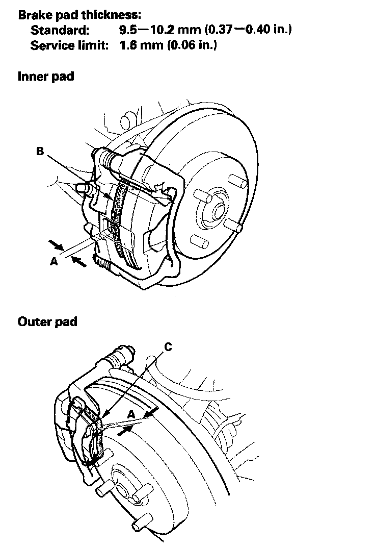 3. Check the thickness (A) of the inner pad (B) and outer pad (C). Do not include the thickness of the backing plate.