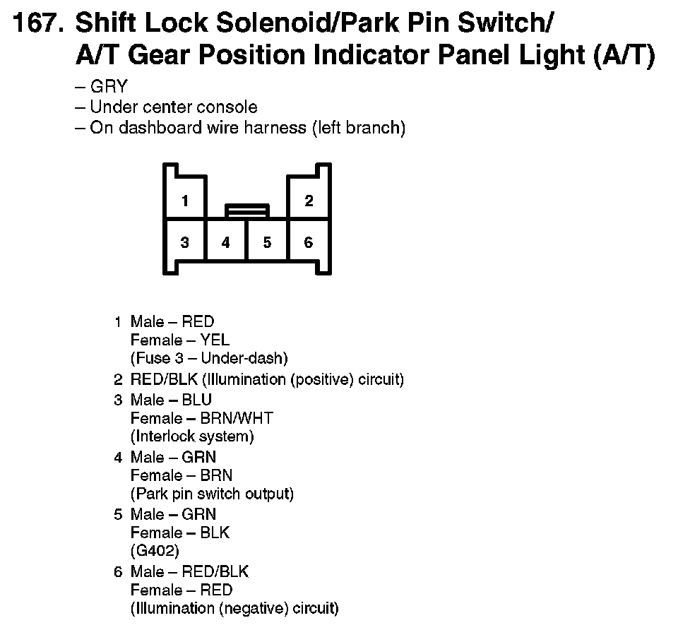 167. Shift Lock Solenoid/Park Pin Switch/A/T Gear Position Indicator Panel Light (A/T):