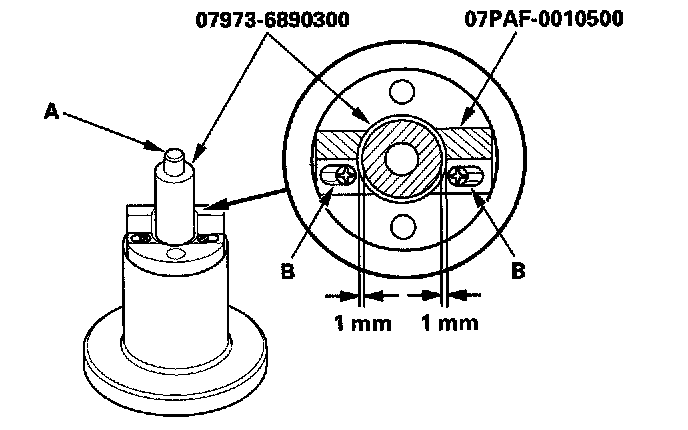 2. Temporarily install the pilot collar over the piston pin base insert (A), and adjust the piston base head inserts as shown, then tighten the screws (B). Remove the pilot collar.