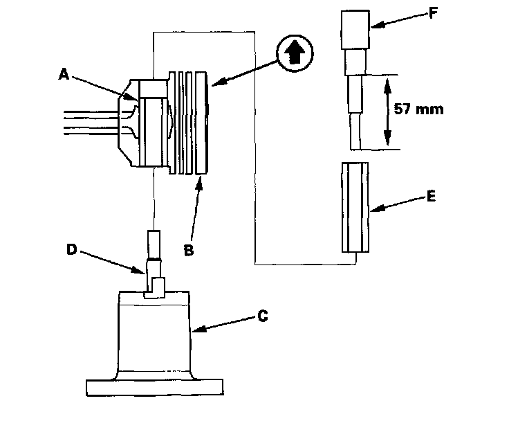 4. With the arrow on top of the piston pointing up, place the piston assembly (A) on the special tool (B). Be sure you position the recessed flat area of the piston against the piston base head inserts (C) as shown.