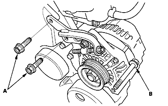 4. Remove the alternator bracket mounting bolts (A) and loosen the alternator mounting bolt (B).