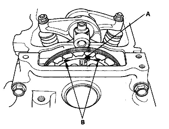 7. Set the No. 1 piston at top dead center (TDC). The "UP" mark (A) on the camshaft sprocket should be at the top, and the TDC grooves (B) on the camshaft sprocket should line up with the top edge of the head.