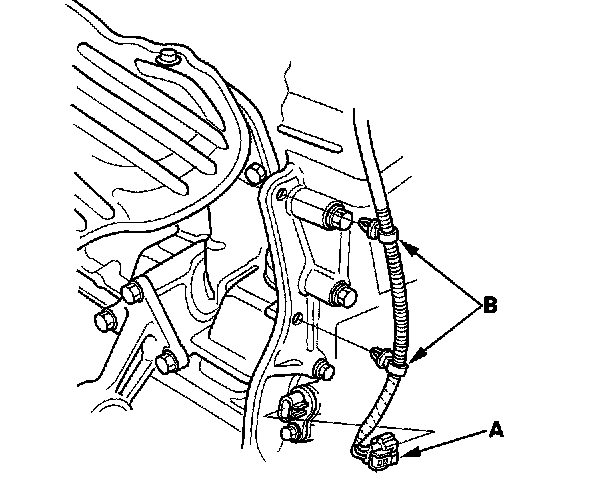12. Disconnect the crankshaft position (CKP) sensor connector (A), then remove the harness clamps (B).