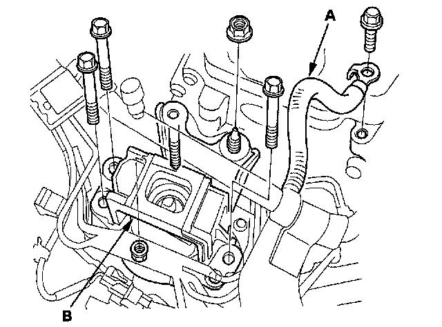 14. Remove the ground cable (A), then remove the side engine mount/bracket assembly (B).