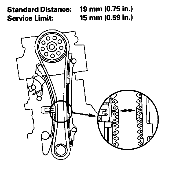 16. Measure the cam chain separation. If the distance is less than the service limit, replace the cam chain and cam chain tensioner.