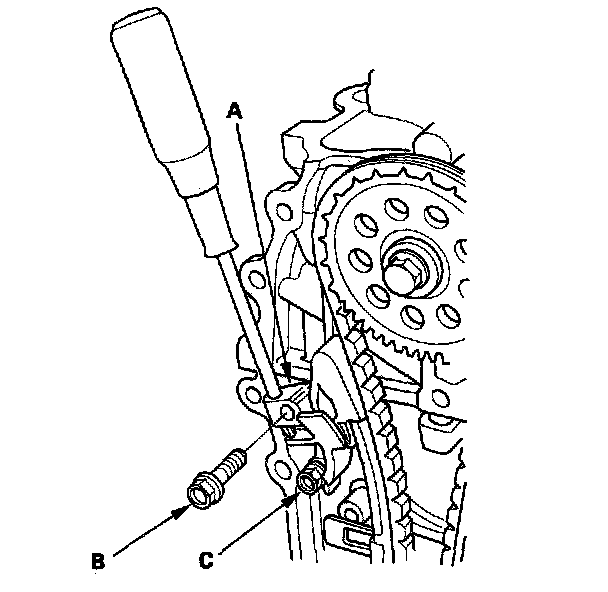 18. Hold the cam chain tensioner slider with the screwdriver, then remove the bolt (B), and loosen the bolt (C).