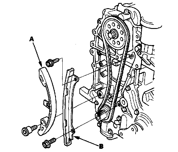 20. Remove the cam chain tensioner (A) and cam chain guide (B).