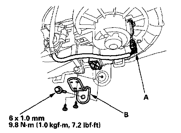 3. Disconnect the connector (A) from the blower motor, then remove the mounting bolt, the self-tapping screws, and the bracket (B).