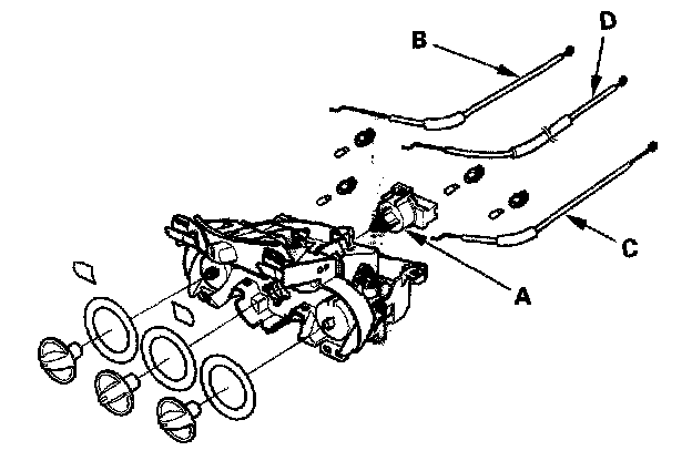 2. Remove the heater fan switch (A), the air mix control cable (B), the mode control cable (C), and the recirculation control cable (D).