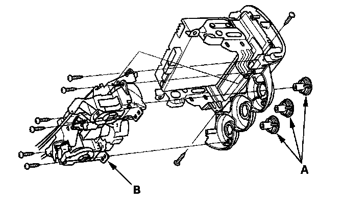 3. Remove the dials (A), then remove the self-tapping screws and the heater-A/C control panel (B).