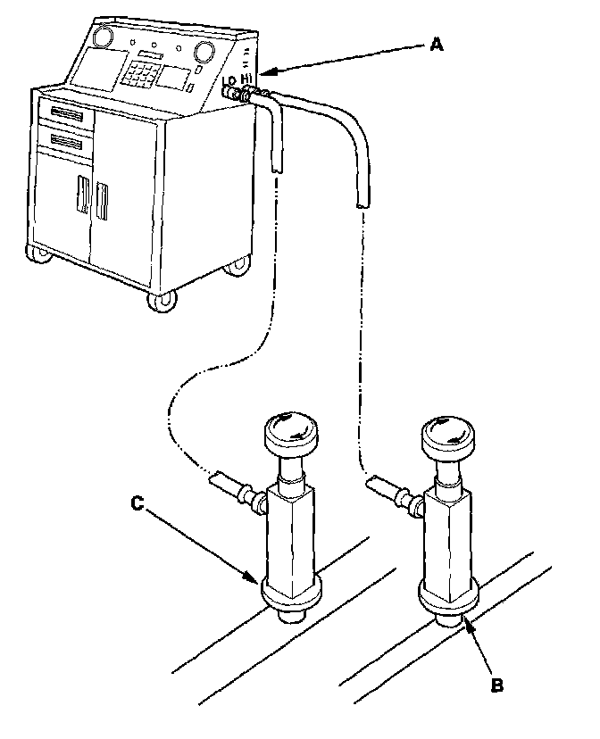 1. Connect an R-134a refrigerant recovery/recycling/charging station (A) to the high-pressure service port (B) and the low-pressure service port (C), as shown, following the equipment manufacturer's instructions.