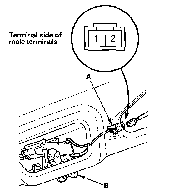 3. Disconnect the 2P connector (A) from the tailgate latch switch (B)