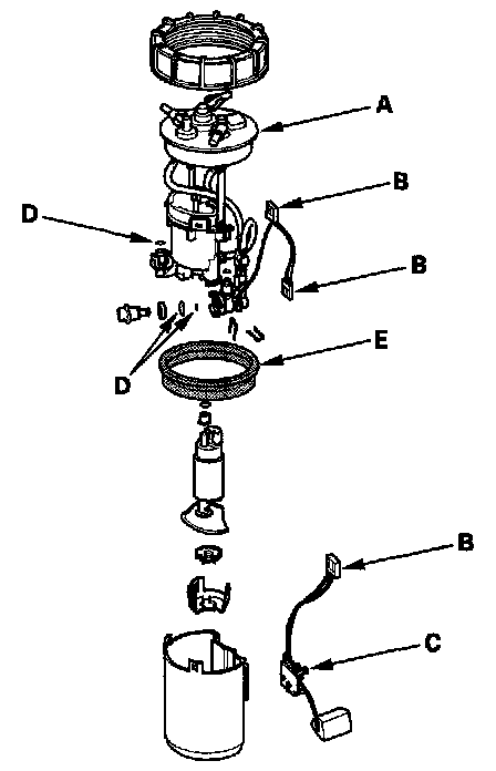 4. Install the parts in the reverse order of removal with new O-rings (D) and new base gasket (E). When installing the fuel tank unit, align the marks on the unit and the fuel tank.