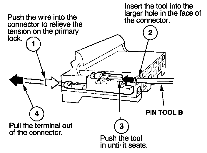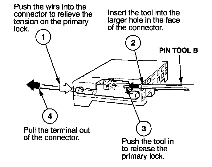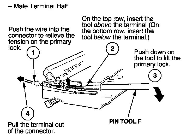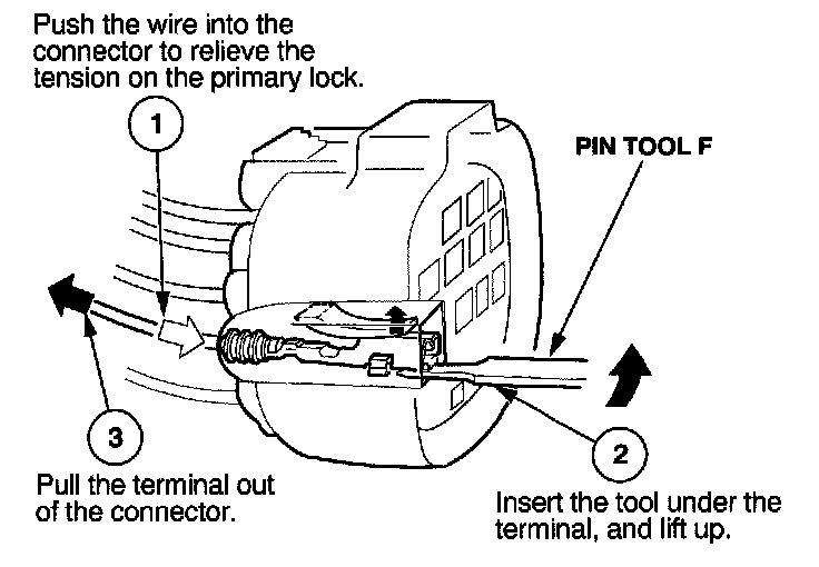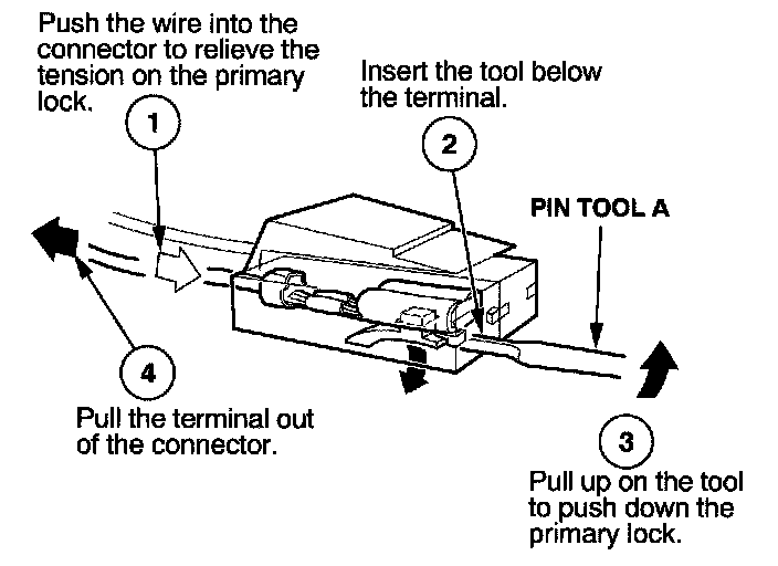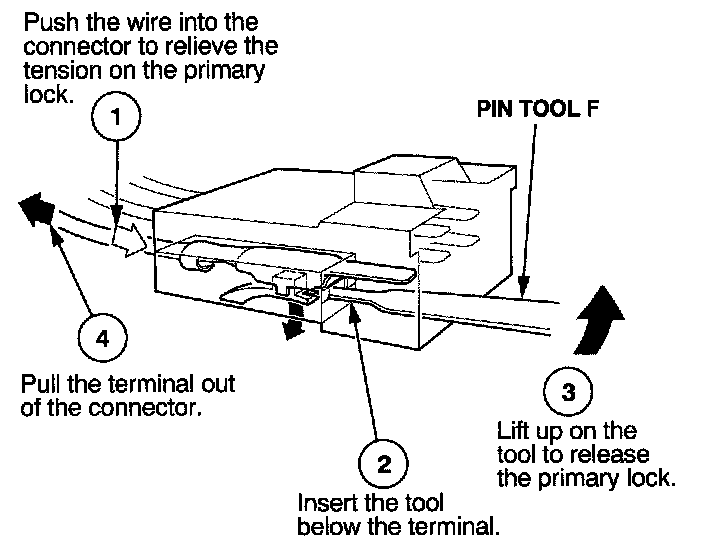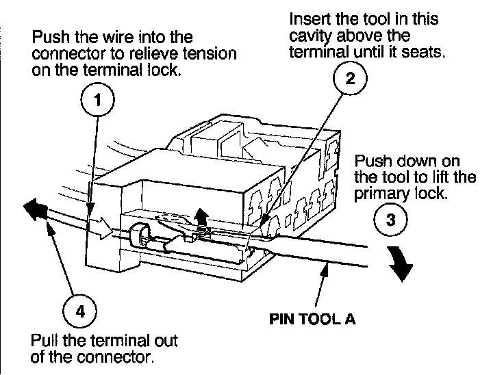 Before you begin, inspect the wire you are about to repair for damage and length. Make sure the wire will be long enough to make a terminal repair without stretching it when you reinstall the terminal in the connector. If the wire is too short, or if access to the connector is too restricted to make a terminal repair, you may need to install a pigtail terminal (a short length of wire with a factory-crimped terminal on it). Refer to HOW TO INSTALL PIGTAIL TERMINALS.