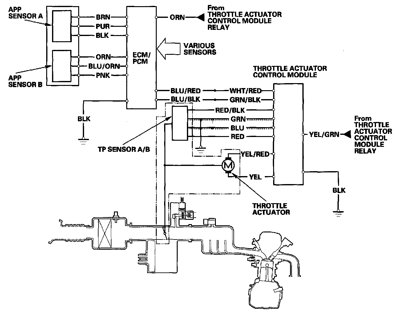 The electronic throttle control system consists of the throttle actuator, throttle position (TP) sensor A/B, accelerator pedal position (APP) sensor A/B, throttle actuator control module, throttle actuator control module relay, and the ECM/PCM.