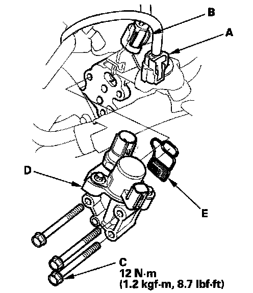 Rocker Arm Oil Control Valve Removal/Installation1. Disconnect the rocker arm oil control solenoid 2P connector (A), rocker arm oil pressure switch 2P connector (B), and the bolts (C).