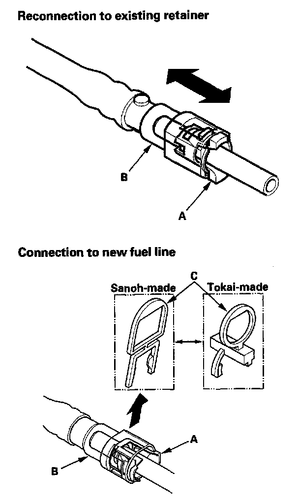 5. When you are reconnecting the connector with the old retainer, make sure the connection is secure and the tabs (A) are firmly locked into place; check visually and also by pulling the connector (B). When you are replacing the fuel line with a new one, make sure you remove the ring pull (C) upwards after you confirm the connection is secure.