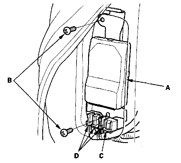 1. Place the new ODS unit (A) on the seat-back frame. Tighten the two bolts (B), and connect the ODS unit harness 18P connector (C) and sensor connectors (D) to the ODS unit.
