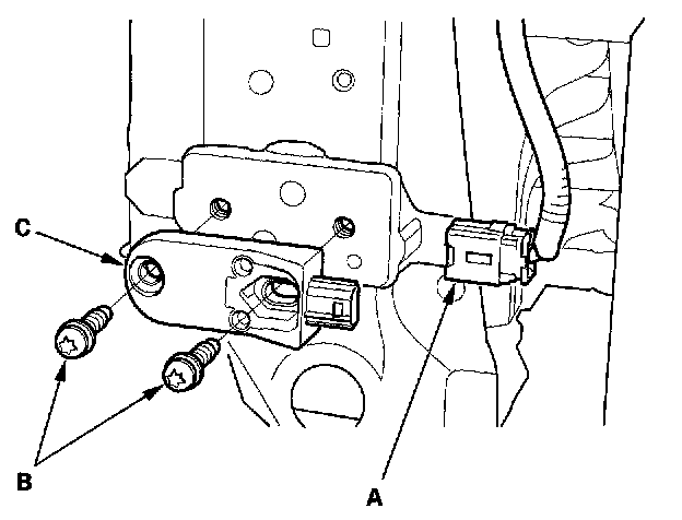 1. Install the new front impact sensor with a new TORX bolts (A), then connect the engine compartment wire harness 2P connector (B) to the front impact sensor (C).