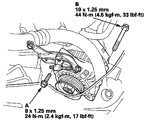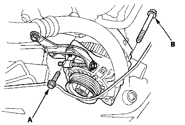 1. Install the alternator, then loosely install the lock bolt (A) and the mounting bolt (B).