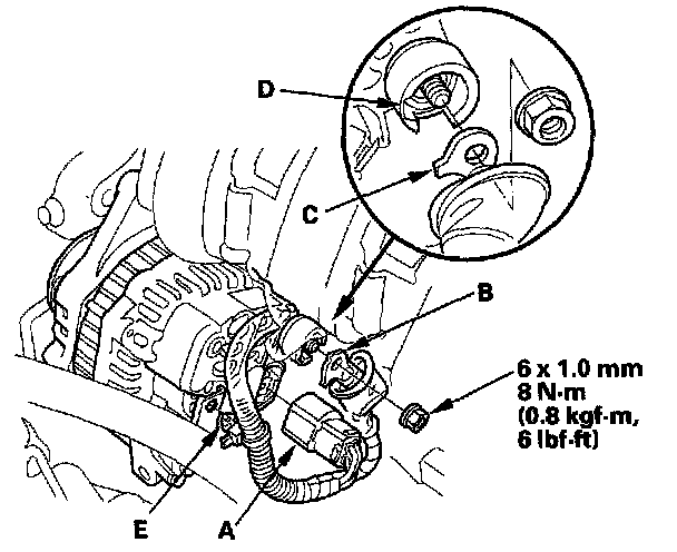 4. Connect the alternator connector (A) and the BLK wire (B) by aligning the tab on the terminal (C) and the groove (D) of the terminal insulator, then install the harness clamp (E).
