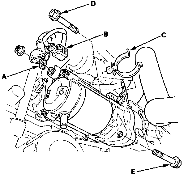 8. Remove the upper mounting bolt (D) and the lower mounting bolt (E), then remove the starter.