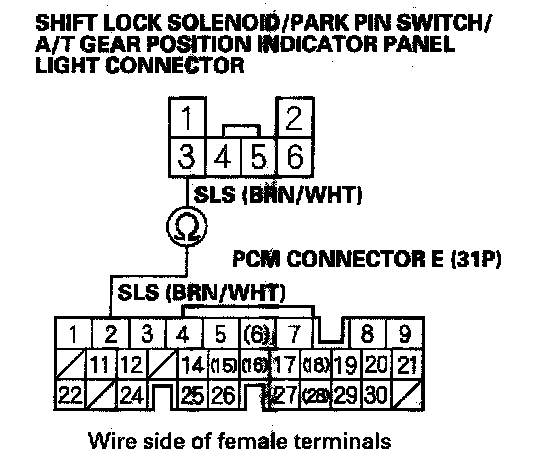 11. Check for continuity between PCM connector terminal E2 and shift lock solenoid/park pin switch/A/T gear position indicator panel light connector terminal No. 3.