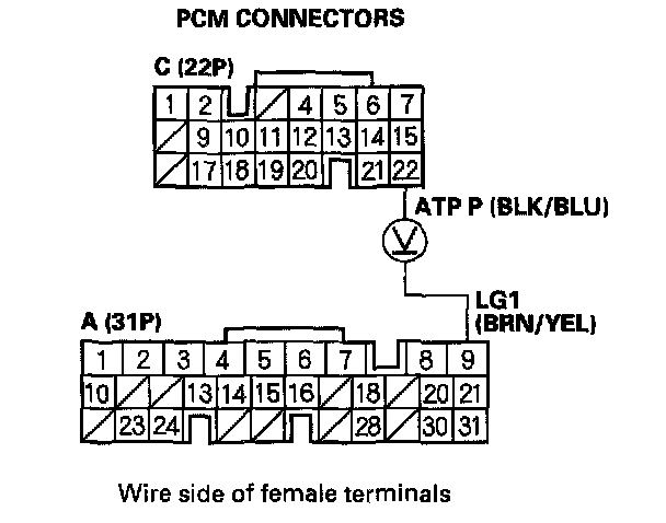 19. Measure voltage between PCM connector terminals C22 and A9.