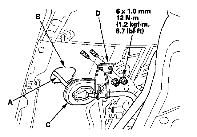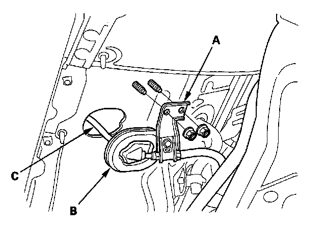 7. Remove the shift cable bracket (A) and the grommet (B), then pull the shift cable (C) out through the hole in the body.
