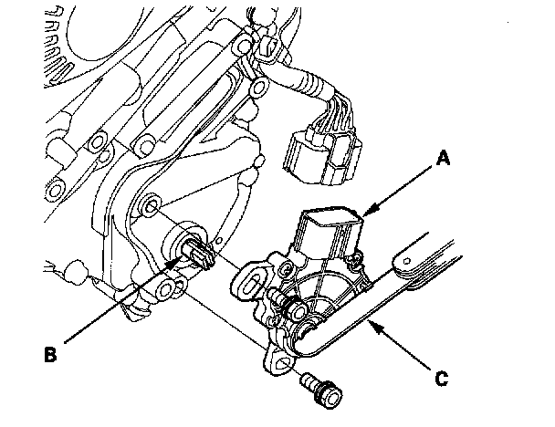 6. Align the cutouts (A) on the rotary-frame with the neutral positioning cutouts (B) on the transmission range switch (C), then put a 2.0 mm (0.08 in.) feeler gauge blade (D) in the cutouts to hold the switch in the N position.