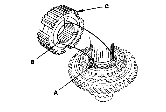 4. Align the fingers (A) on the friction damper with the grooves (B) on the 1st/2nd synchro hub (C), then install the 1st/2nd synchro hub onto the countershaft.