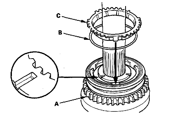 5. Install the reverse gear (A), synchro spring (B), and synchro ring (C) on the countershaft.