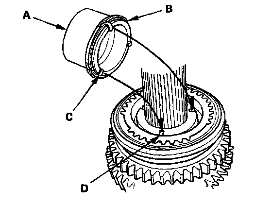 6. Install the distance collar (A) and friction damper (B), then align the fingers (C) on the friction damper and grooves (D) in the 1st/2nd synchro hub.